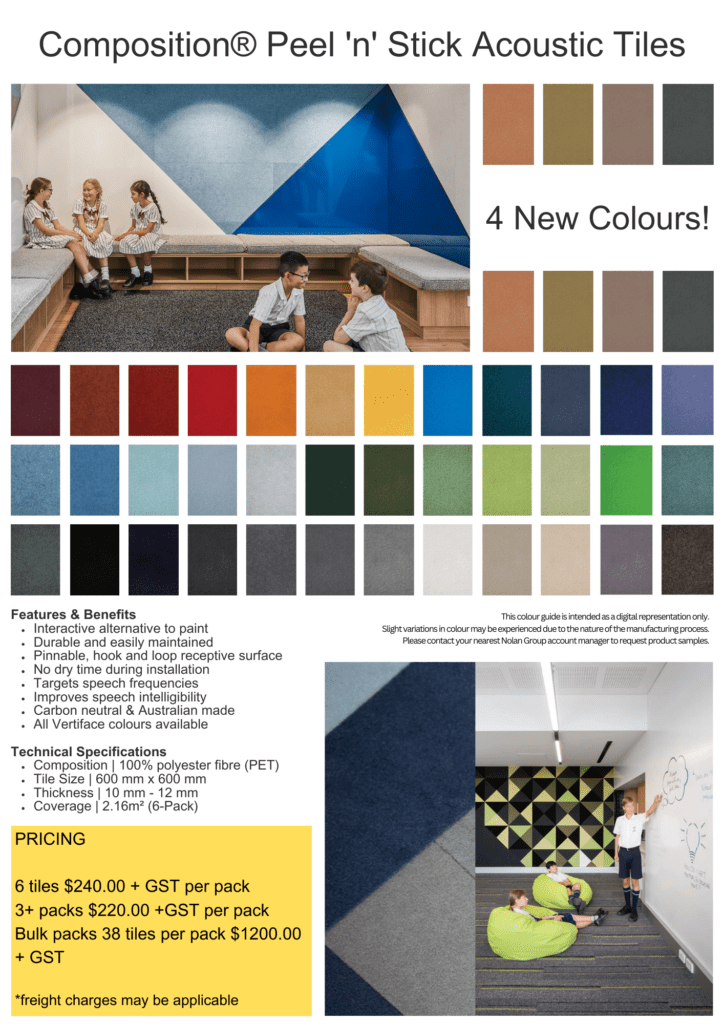 Now is the perfect time to order and receive your carpet tiles and acoustic solutions in time for the school holidays!